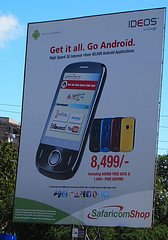 Most of the Ethiopian Internet cafes I saw used client software from China Telecom. Chinese feature phones are increasingly popular, mostly because they’re cheaper than Nokias. You can buy a US$100 Android phone here in Kenya (see picture) but Android isn’t exactly optimized for the developing world, and it’s surely only a matter of time before phones running Tapas OS or another Chinese Android fork start competing in the smartphone market.